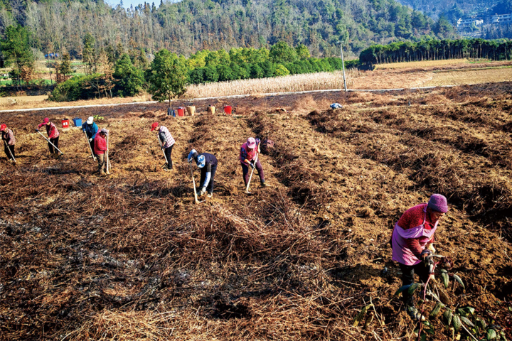 记者在石郎村看到,田野里十余位村民正弯腰清理金荞麦残株,有的则操控农机进行深耕作业,空气中弥漫着泥土与药材的混合清香。