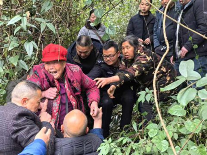1月23日11时30分,队员在陡峭茂密的草笼中发现蜷缩的老人。此时老人已失联16小时,身体虚弱、满身泥屑。队员当即用镰刀砍出救援通道,确认老人无明显外伤后,合力将其扶出(如图)并移交家属与医护人员。家属热泪盈眶,再三向工作人员致谢。