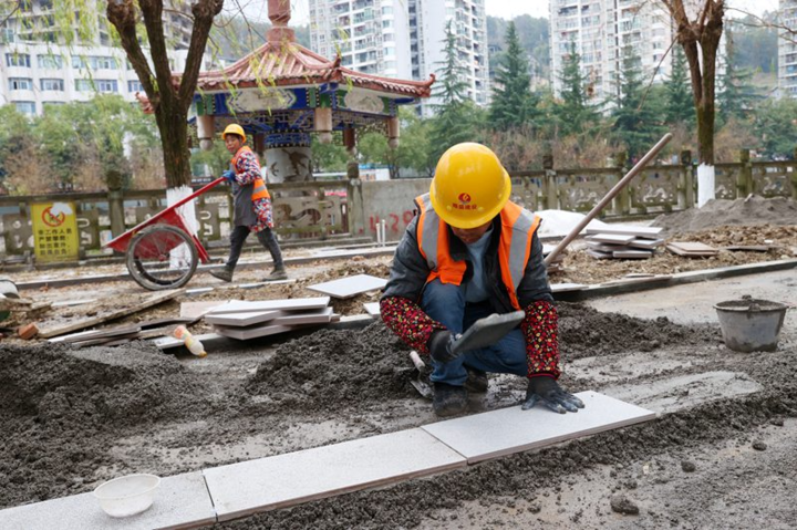 1月25日,工人在黔江老城区河滨路整体改造工程工地施工。黔江区老城区河滨路整体改造工程长12.5公里,综合提升总面积约19公顷(不含水体),是将整个老城区打造为“4A”级景区的核心启动工程,包括供水管网、公共服务设施、道路人行道及大规模美化绿化等。目前该工程正在加紧施工中。