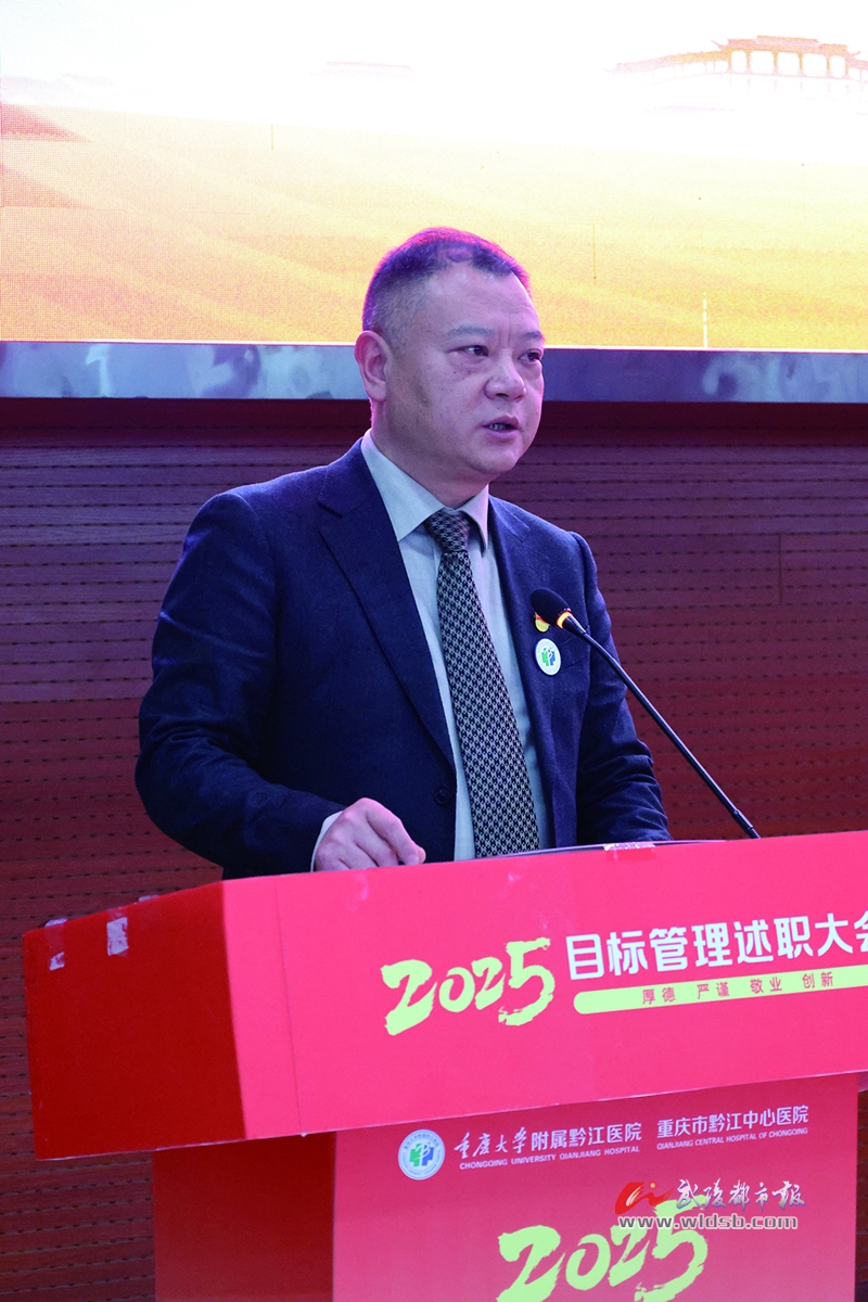 本报讯(记者 王安娜 文/图)党建引领强根基,凝心聚力共前行。1月31日,重庆大学附属黔江医院(黔江中心医院)召开了“聚力前行 共绘蓝图”2025年党建统领高质量发展综合目标管理述职会议。旨在通过亮点展示鼓舞干劲,通过问题查摆弥补短板,通过科学谋划明确思路,以高质量党建引领医院高质量发展。院领导、银发专家、支医专家、各科室代表,以及来自黔江、酉阳、彭水等区县的相关医疗机构负责人共聚一堂,为促进渝鄂湘黔医疗卫生健康事业大发展贡献智慧和力量。