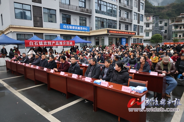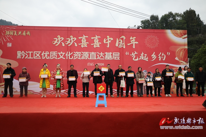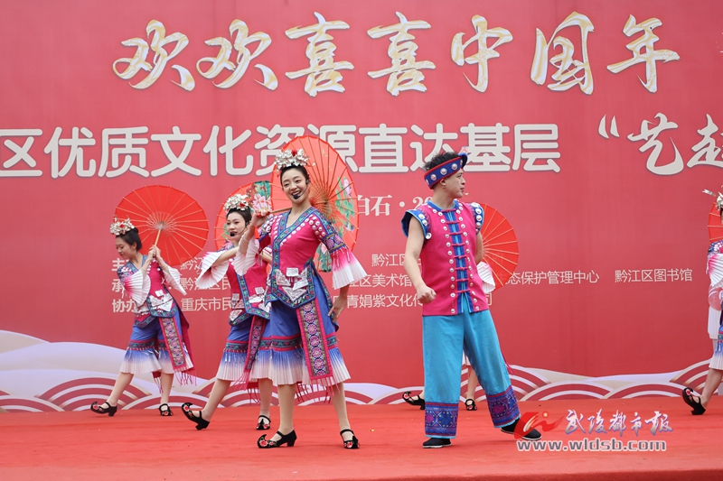 本报讯(记者 王安娜 文/图)1月29日,黔江区白石镇政府广场人来人往、一片欢乐。当天,由区文旅委、白石镇人民政府主办的“春风策马·艺起相约”欢欢喜喜中国年暨农特产品推介活动,在这里热闹开场。载歌载舞的节目、琳琅满目的特产,为当地老百姓带来了一场年味十足的“村晚”。