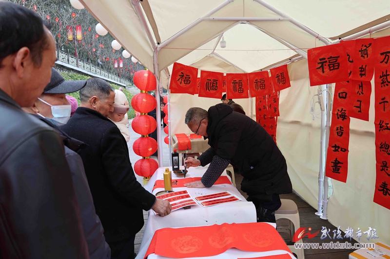 “一边逛吃逛吃,一边欣赏书法文化,内外兼具。”在春联摊位处,书法家们为现场的市民朋友挥毫泼墨,创作了一副副载满新春祝福的春联。