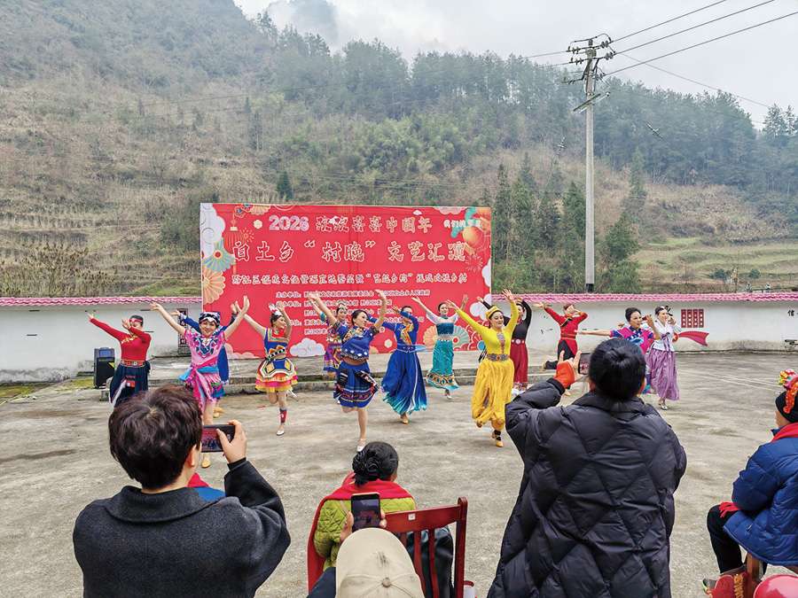 村民们化身“草根明星”,用最真挚的情感、最朴实的演绎,唱身边事、演身边人,道家乡美、赞新生活。《欢乐中国年》《阿佤人民唱新歌》两首经典曲目演奏,欢快的节奏、灵动的曲调,将新春的喜悦传递给现场每一位观众;歌伴舞《土家人的中国梦》曲声豪迈、舞姿铿锵,将土家摆手舞的古朴风韵与时代追梦的昂扬意气相融,既荡漾着武陵山间的民族风情,又抒发着同心筑梦的家国情怀,把乡土欢歌与时代愿景演绎得动人心弦;舞蹈《相亲相爱一家人》舞姿温婉、暖意绵长,将邻里相守的淳朴温情与家园相伴的真挚心意相融,既藏着乡村烟火的和睦韵味,又抒发着同心相守的美好期许,把团圆之乐与邻里之情演绎得温情动人……表演者虽非专业演员,却以饱满的热情、真挚的情感,打动着现场每一位观众,他们脸上洋溢的幸福笑容,正是基层文艺最动人的底色。