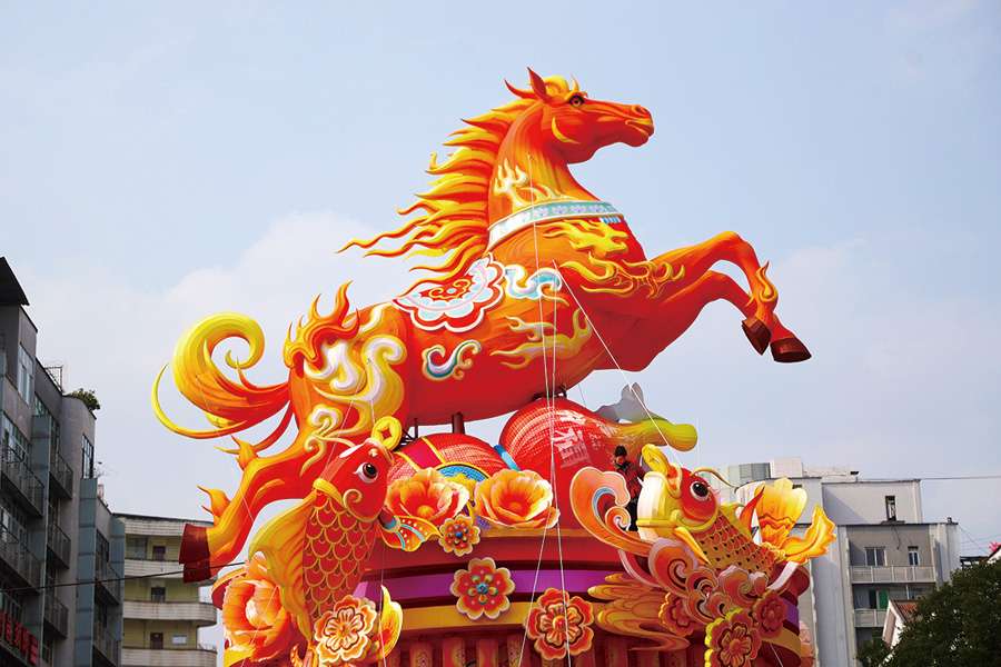 2月8日,工人在黔江老城区转盘处安装奔马迎春灯饰。