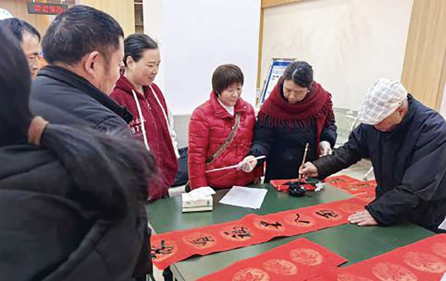 本次活动特别邀请黔江区书法家协会副主席任正全,以及渝北区书法家协会会员现场挥毫,书法老师凝神运笔、行云流水,一副副寓意吉祥、对仗工整的春联与“福”字跃然纸上(如图)。