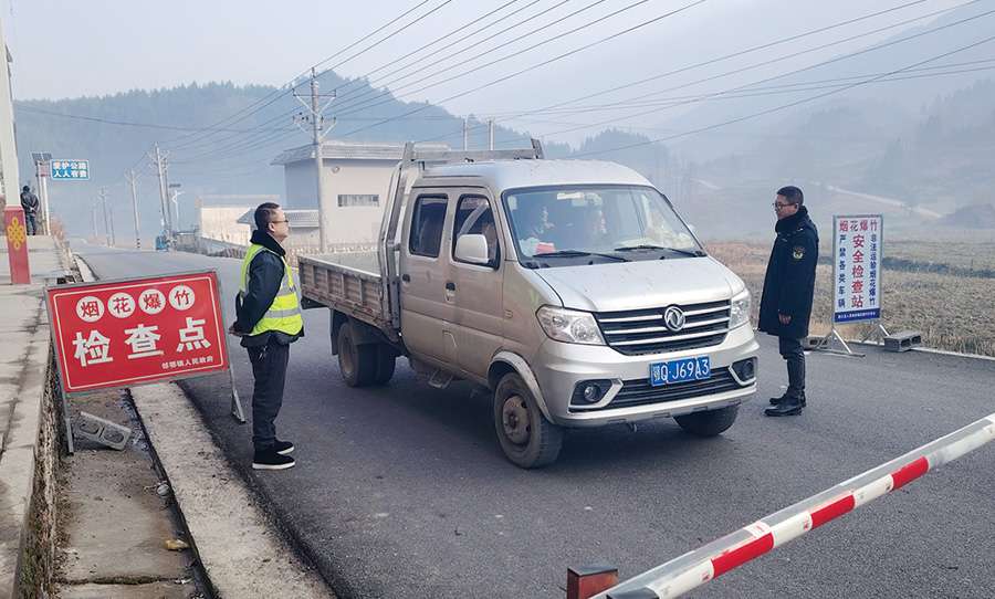 邻鄂镇地处渝鄂交界,属高寒山区,冬季道路湿滑且毗邻地区烟花爆竹流通频繁,管控难度较大。针对这一实际,镇政府在集镇主要路口设立烟花爆竹安全检查站(如图),开展常态化检查,重点严查非法运输、携带烟花爆竹行为,坚决阻断外地烟花爆竹流入黔江的渠道,从源头消除安全隐患。