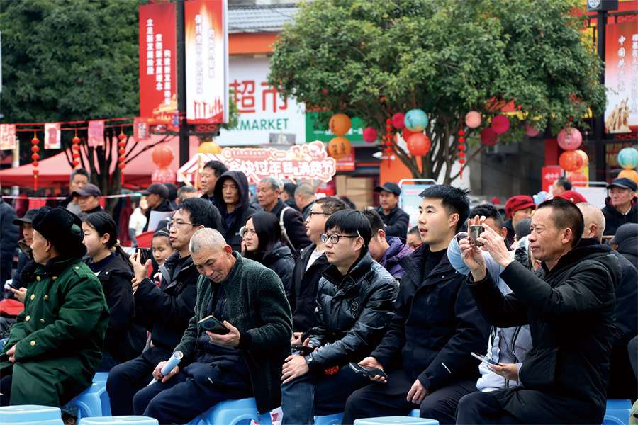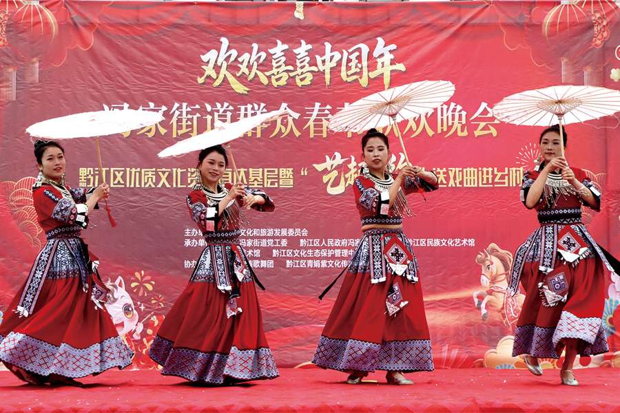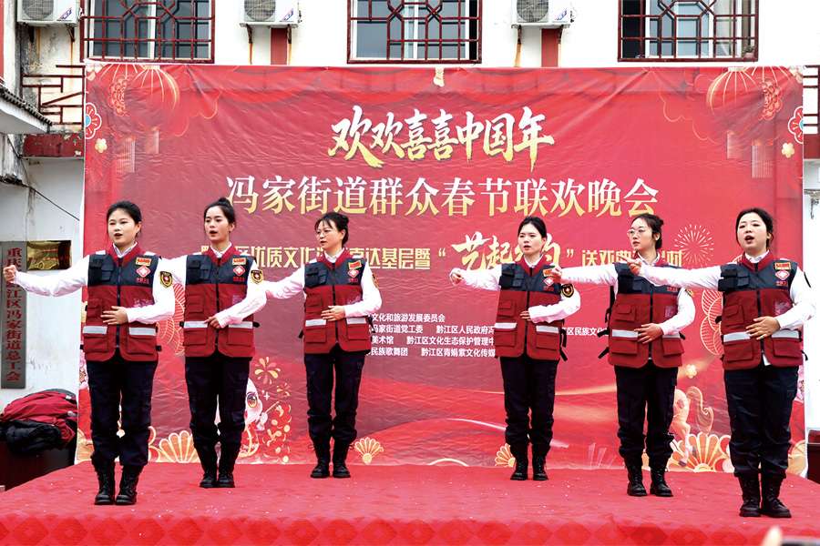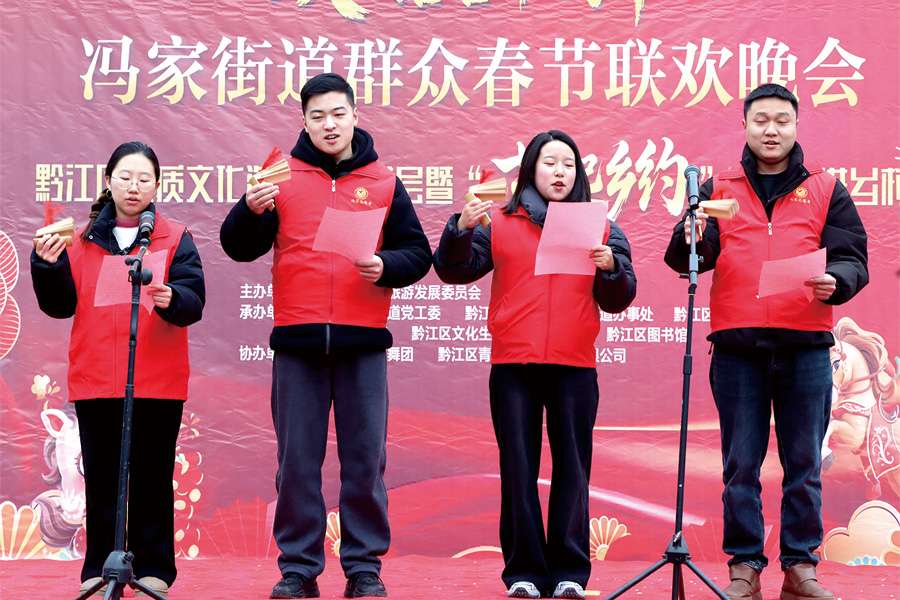 本报讯(记者 李诗素 文/图)2月10日,黔江区冯家街道群众春节联欢晚会热闹上演。来自辖区8个村(社区)的群众自编自导自演,用接地气的文艺节目喜迎新春,既营造出喜庆祥和的节日氛围,也把惠民政策、基层治理成果搬上舞台,赢得现场干部群众一致好评。