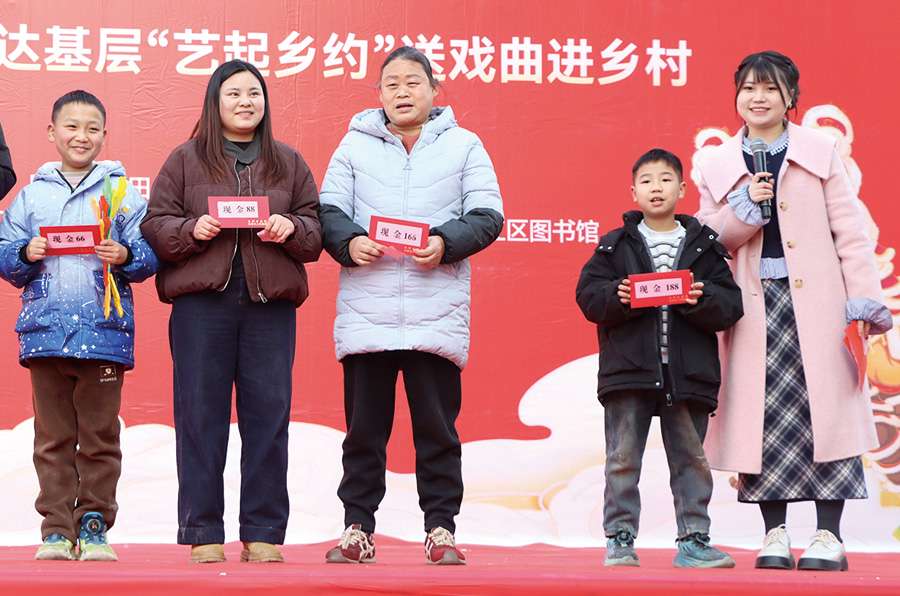 活动现场张灯结彩、人声鼎沸,处处洋溢着喜庆祥和的节日氛围。即使没有华丽布景的百姓大舞台,却因村民的热情参与而格外热闹。四个村(社区)的干部和部分群众轮番登台,为观众表演了歌曲、舞蹈、小品、顺口溜、农具走秀等13个接地气、有温度、聚民心的节目,用最质朴的表演传递新春祝福,诉说乡村发展变化。
