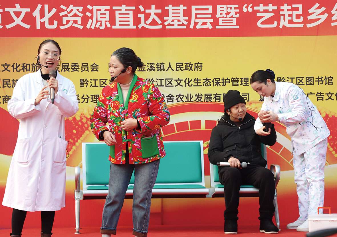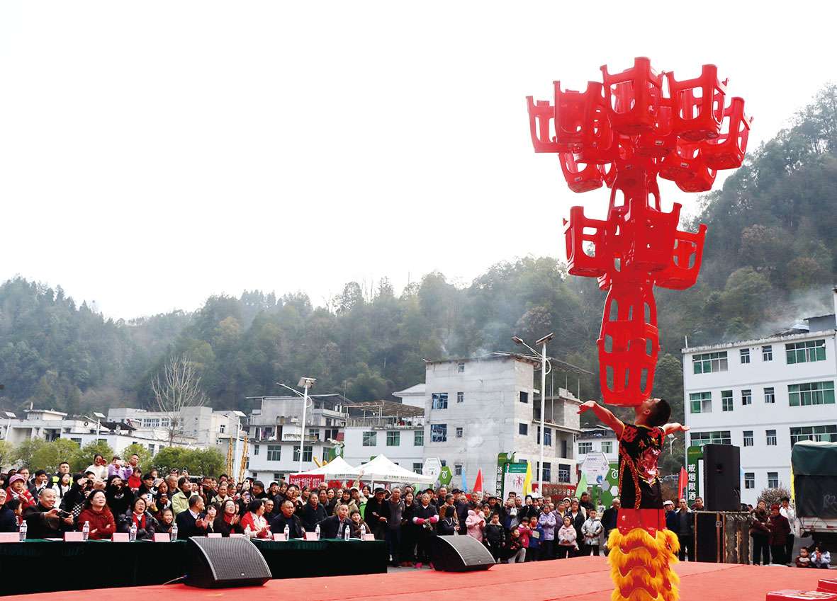 “村晚”现场所表演的节目,由各村(社区)精心推选、群众自编自演,突出 “金狮欢腾跃新程 骏马奋蹄迎盛世”的乡土气息与新春喜气主题。传统拜年舞狮表演瞬间点燃全场热情,金狮翻腾跳跃、灵动威武,为当地干部群众送上新春祝福。随后,各类文艺节目轮番登台、精彩纷呈;舞蹈《象王行》展现黔江儿女昂扬风貌和豪迈风采;《好运全都来》欢快喜庆的节奏,传递新年美好祈愿;望岭村陶氏家族带来的《哩啦腔》,原汁原味唱响土家山歌,尽显非遗魅力;情景剧《生命时速》扣人心弦,用表演的方式传递正能量,预防突发疾病、守护生命安全;杂技《顶技》,用下巴顶起50余个胶凳子不偏不倚,其技艺精湛、扣人心弦,引来观众阵阵喝彩;小品《美丽黔村直播训练营》紧扣乡村振兴与电商助农热点,诙谐幽默又贴近生活,让观众在笑声中感受乡村新变化。
