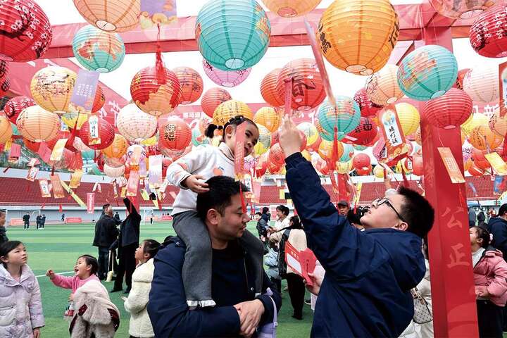 3月3日,正月十五元宵佳节。当天,由黔江区委宣传部、区文化旅游委共同主办的黔江区第八届元宵灯谜会,在区体育场热闹举行。活动 将“运动+灯谜”巧妙融合,以“传统中华年・运动闹新春”为主题,除了猜灯谜这盘“主菜”外,还融合了趣味篮球、象棋、羽毛球、足球、乒乓球、匹克球、跳绳、踢毽子、投壶等多项运动项目,吸引了众多市民朋友参与。图为家长带着小朋友猜灯谜。