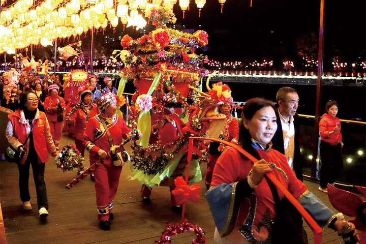 本报讯(记者 李诗素 文/图)3月2日至3日,黔江区元宵节城区花灯巡游活动火热举行。潮汕英歌队与本地传统龙狮队、龙船队、连响队、鱼灯队等联袂登场,沿武陵水岸亲水步道、武陵水岸牌坊、南海鑫城、人民小学、后街、红军广场、解放路等核心路段巡游展演,为市民献上一场年味十足、南北交融的元宵文化盛宴。