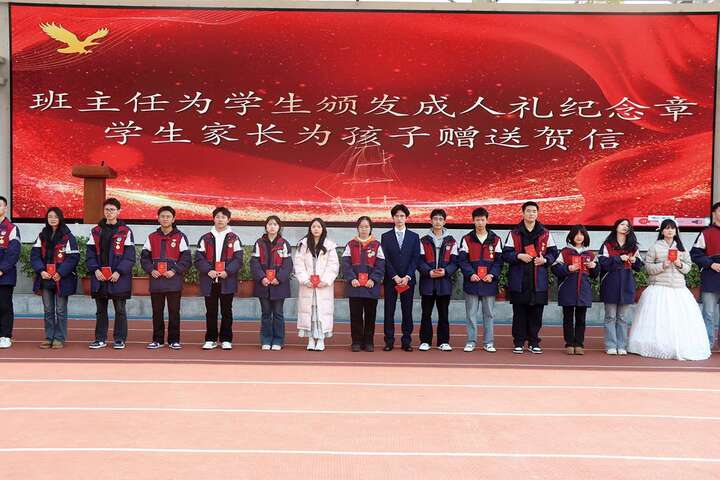授礼仪式上,班主任与家长分别为学生佩戴纪念章、赠送贺信与礼物,寓意责任传承、使命在肩。在领誓人张浩带领下,全体学生进行宪法宣誓,许下成人承诺,齐唱《我和我的祖国》,将现场氛围推向高潮。