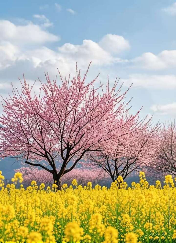 桃花与油菜花掩映