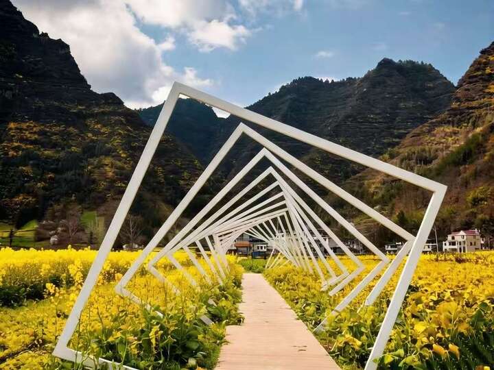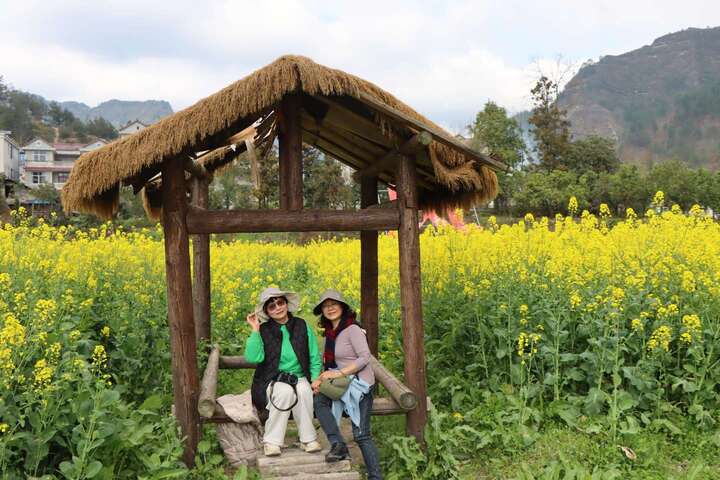 小南海镇的油菜花海,最动人之处不仅在于其壮观,更在于其“精致”。不同于传统的粗放种植,今年的黄金花海里多了一份“以人为本”的巧思。当地政府在观景线路上精心布局,搭建了与自然景观浑然一体的草棚茶寮和农事体验展台。游客走累了,可在草棚下歇脚,品一杯当地产的藤茶;孩子们则能在展台前近距离观察传统的农耕器具,了解油菜从播种到收获的全过程。
