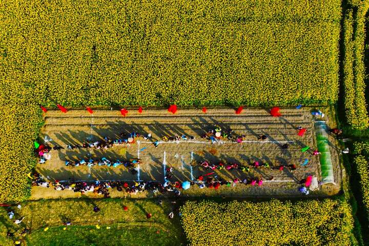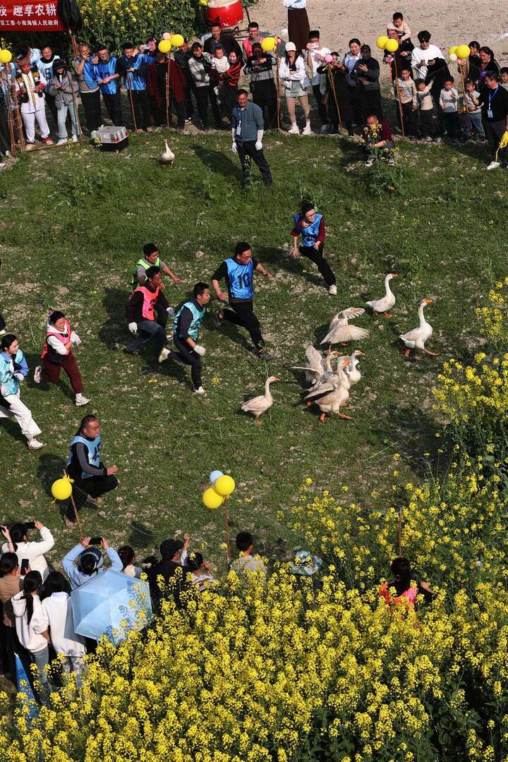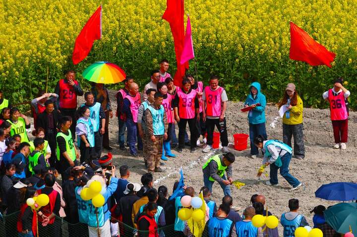 3月13日,重庆市黔江区小南海镇与湖北省咸丰县大路坝区联合举办的渝鄂边区农事趣味运动会在两地结合部的油菜花田里举行。赛事设拔河、接力运粮、引水灌溉、颗粒归仓、五谷丰登、守护家园等项目。