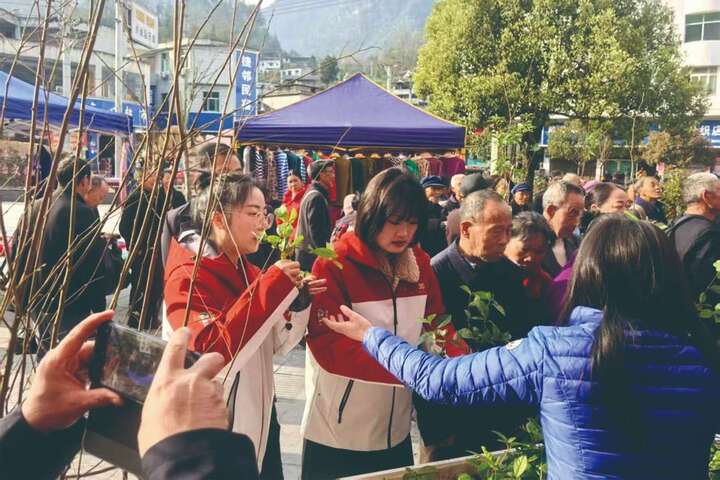 活动依托林业保障性苗圃繁育基地,精选大叶榉树、檫木及珠兰花苗等本地珍贵良种,利用集镇赶场集中派送(如图),用于公共场所绿化和乡村庭院绿化美化。因派送树种具有生态景观和经济价值,受到群众欢迎,不到半小时300余株树苗就被“抢夺一空”。