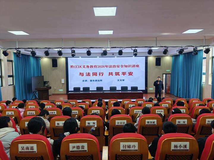 本报讯(通讯员 蔡雪姣 陈炼 文/图)近日,黔江区蓬东乡开展了2026年春季安全、法治宣讲进校园活动。司法所、派出所2名主讲人以讲座授课的方式向全校师生讲解了毒品的危害以及禁毒知识、未成年人保护知识、消防安全知识、铁路护路安全知识、道路交通安全知识和未成年人预防性侵知识,同时开展了“学习民法典、做遵纪守法好公民”专题讲座。
