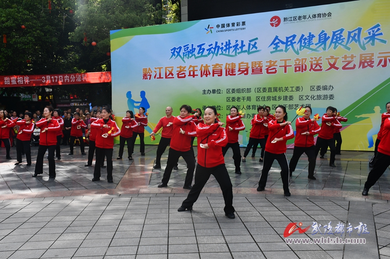 本报讯(记者 谭鹏 文/图)4月23日上午,黔江区“双融互动进社区 全民健身展风采”老年体育健身暨老干部送文艺展示活动,在红军广场举行。该活动由区委组织部(区委直属机关工委)、区委编办、区委老干部局、区住房城乡建委联合主办。